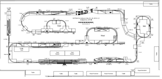 Here you can study the various layout design styles used over the years. Perhaps this page will provide inspiration for a completely new design stye. Loop & Branch is the club's standard design which consists of two loops connected together by a mainline with random branches. FreeMo on the main incorporates single track modules into the double track mainline. There are three loop based designs: Loop Mid has a middle loop between East and West loops. Connected loop has a non-mainline connection between East and West loops. Loop in a loop has a smaller loop inside a larger loop but shares some of the same track. S-design is a three leg design normally with one of the outer legs facing outwards and one inwards. Wye & Tail design is one in which the mainline passes through the tail of a wye. OVAR layouts are designed for Ottawa Valley Associated Rairoaders big modular rally each January. Shows encompasses layouts designed for numerous events over the years. Click type titles to return to the top of the page.